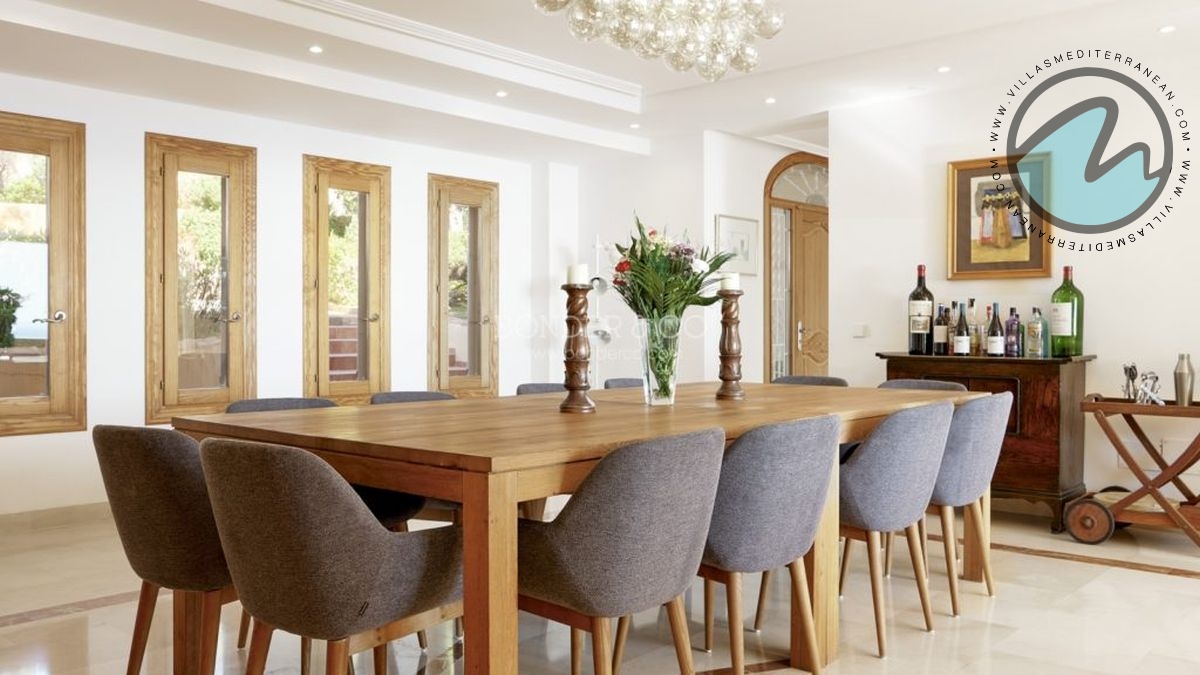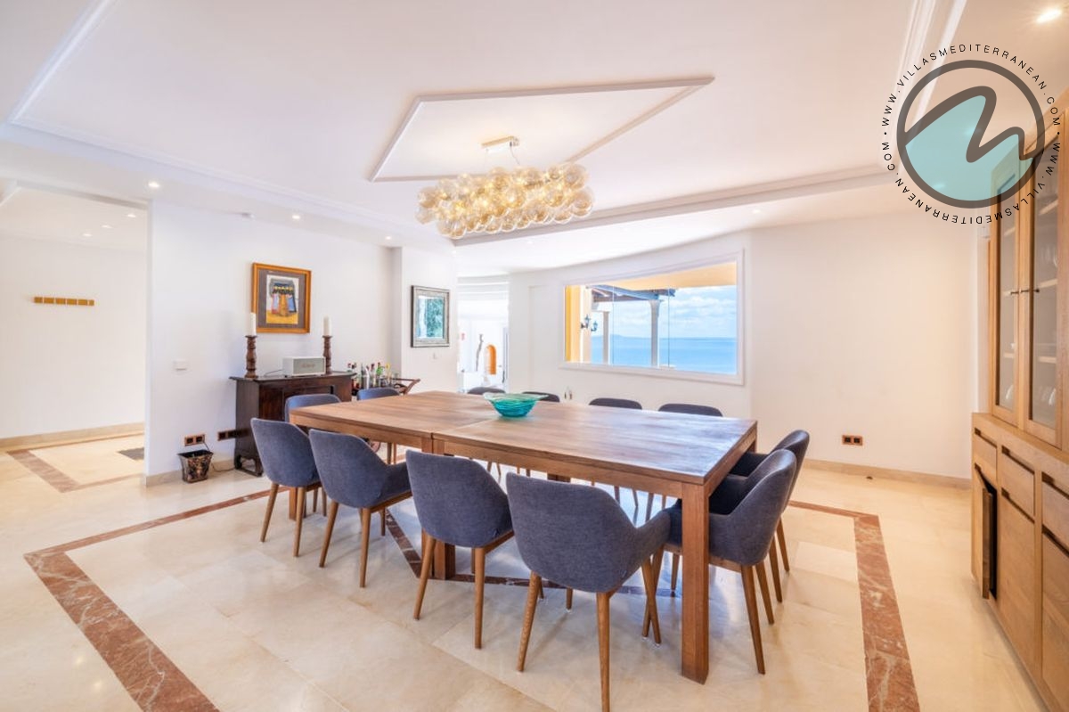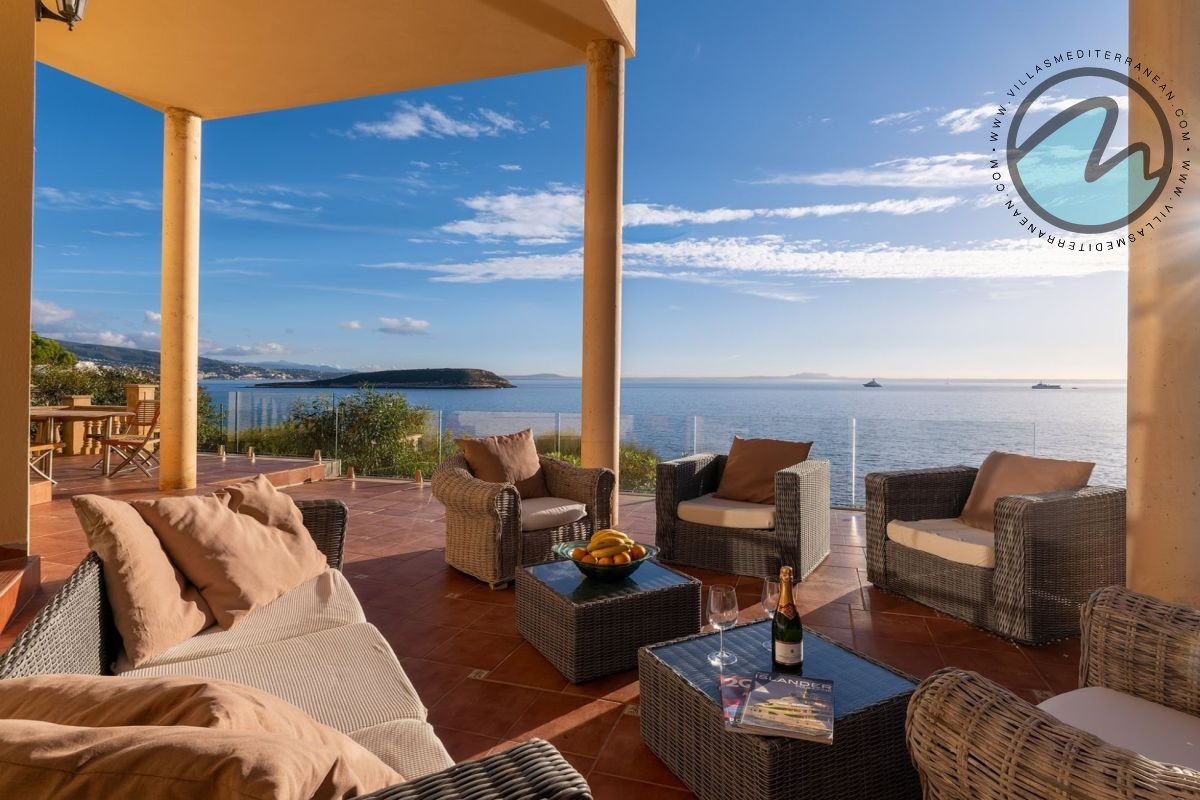 Step into a living experience where the Mediterranean light pours through expansive windows and terraces. This exceptional property occupies over 700 m² on a 2,200 m² plot and delivers panoramic views of the bay from virtually every principal room. The villa’s architecture and furnishings reflect a warm Mediterranean style — terracotta floors, timber details and sun‑bathed outdoor living areas.