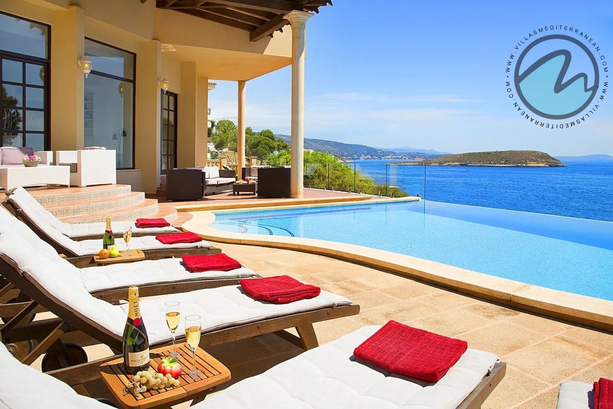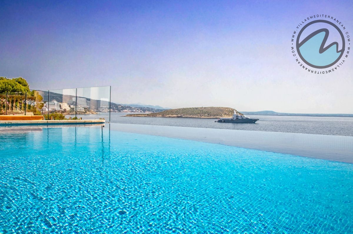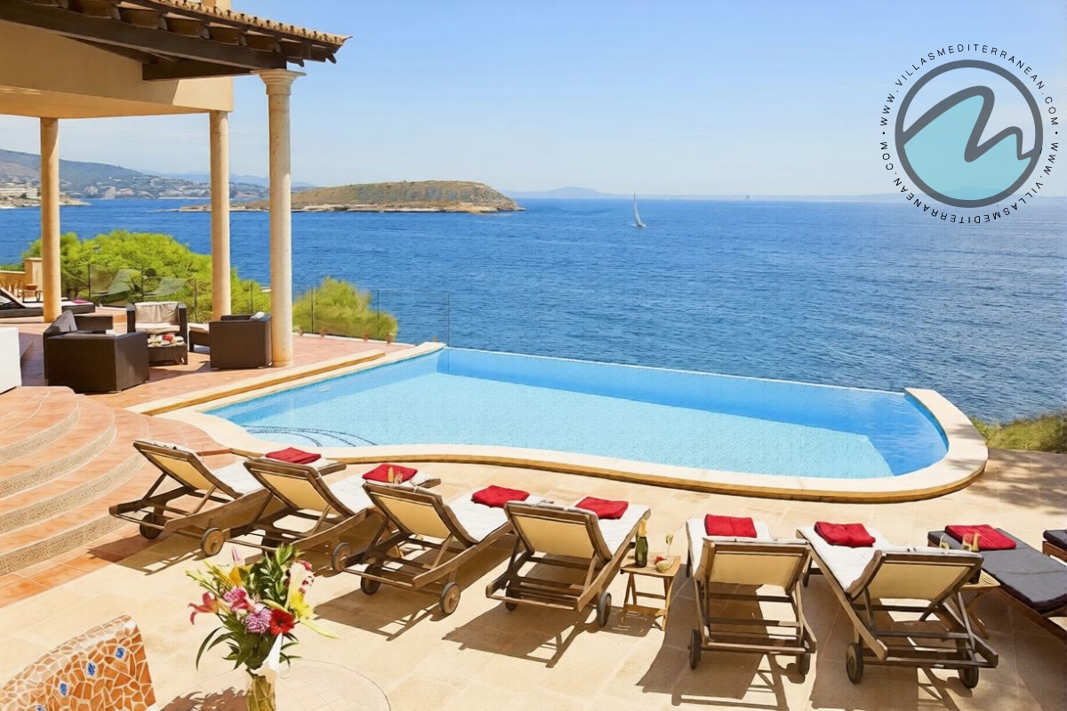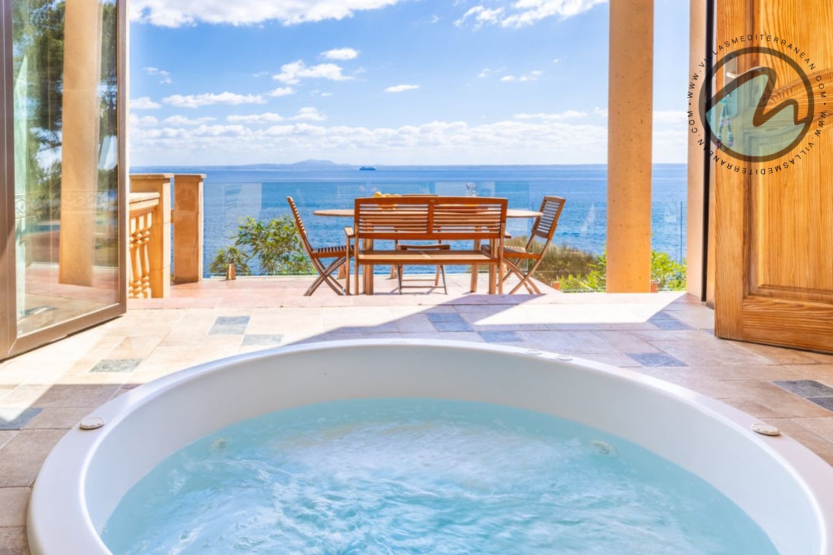 Summary: Villa Mediterranean Island is a spectacular sea‑front villa in Cala Vinyes, Majorca, designed for large families and groups. With sweeping uninterrupted sea views, an infinity pool, private heated Jacuzzi, multiple terraces and generous indoor living spaces, this Mediterranean retreat blends luxury, comfort and family‑friendly features just 300 metres from the Blue‑Flag Cala Vinyes beach.