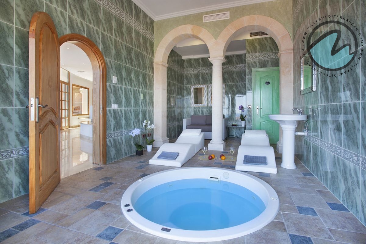 Sleeping and bathing are arranged for absolute comfort and privacy. The villa features multiple suites, each with ensuite bathrooms, independent air conditioning and ceiling fans, satellite TV and Bluetooth audio. The main suite includes a private terrace, an expansive walk‑through dressing room, an ensuite bathroom with a Jacuzzi bathtub, and access to a separate bathroom with a massage shower. In total the property offers 7 bathrooms, plus a guest bathroom and an additional WC and wash basin in the heated Jacuzzi chill‑out lounge — ideal for large family groups.